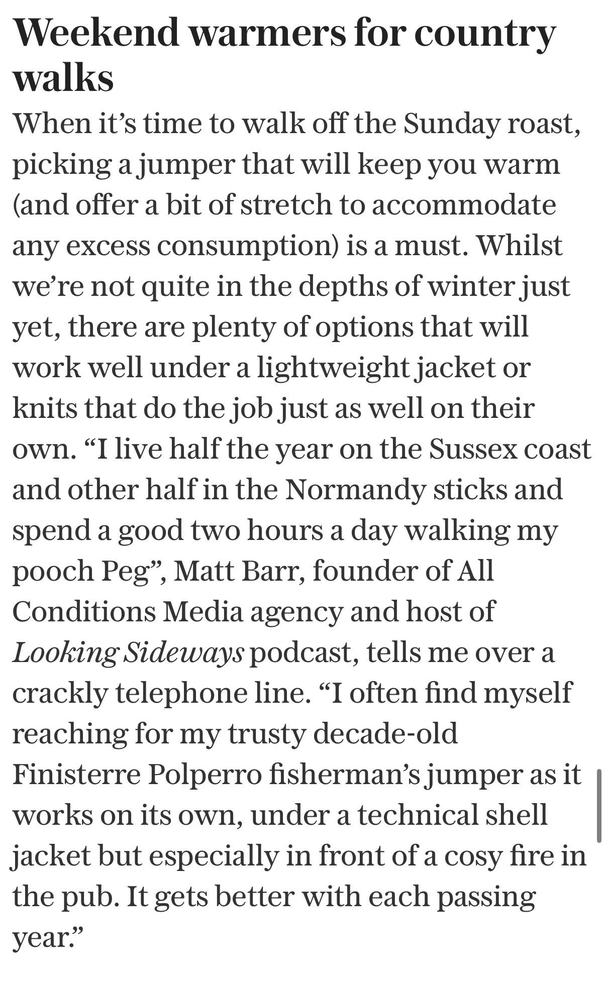 My code LOOKINGSIDEWAYS10 will get you 10% off any order from Finisterre - yes, including one of those self-same Polperro jumpers.